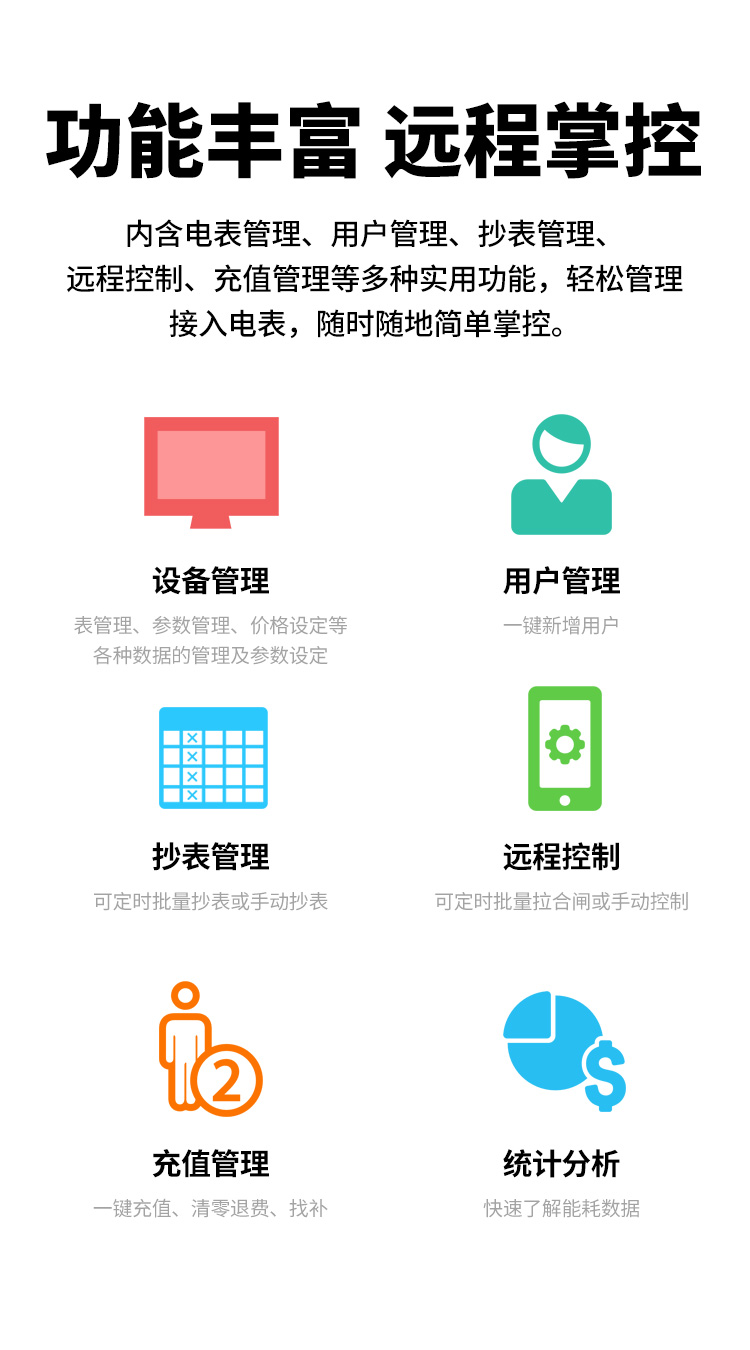 本公司DDSY6111/DDZY6111家用WiFi遠程智能電表與本公司遠程抄表系統和手機APP配套使用,遠程抄表管理系統具有實時抄表、定時抄表外,還提供了設備管理功能,如告警、余額短信通知、遠程充值、手機抄表、手機查詢、手機充值、預付費、后付費、自助充值機充值、遠程拉合閘、各種查詢報表、統計報表下載等功能。