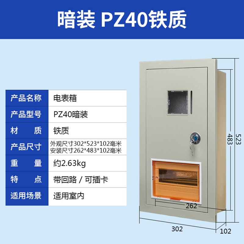 我公司生產(chǎn)的PZ40電表箱采用0.5-1mm厚冷軋鋼板和進(jìn)口PC高透視窗,并帶有門鎖,安全防盜,大氣美觀。可安裝各類電能表和C45、空氣開關(guān)、斷路器閘刀等,廣泛用于家庭、公寓、學(xué)校、工廠等場(chǎng)所。