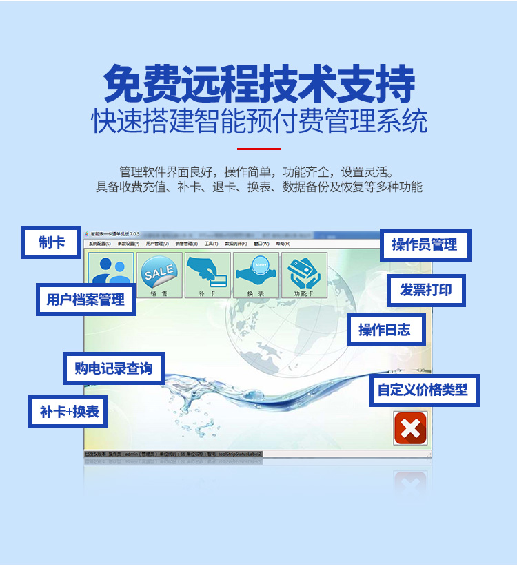 該管理軟件具備收費(fèi)充值、補(bǔ)卡、退卡、換表、數(shù)據(jù)備份及恢復(fù)等多種功能。降低了物業(yè)管理成本,提高了工作效率,減小了勞動(dòng)強(qiáng)度,水電費(fèi)用提前收繳到位,而且?guī)つ繙?zhǔn)確、清晰。